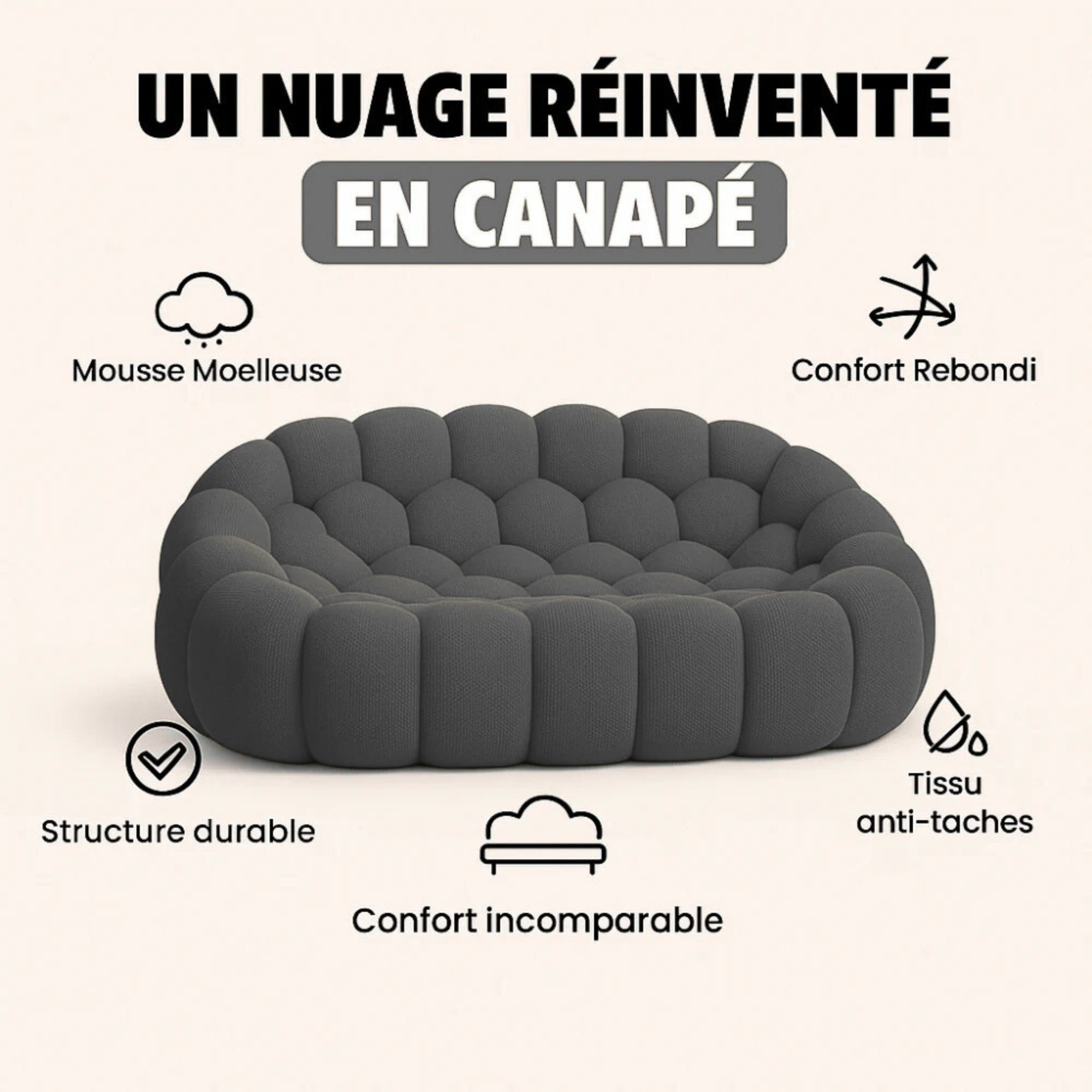 Le Canapé Bubble Gris incarne cet équilibre parfait : une allure contemporaine, une qualité irréprochable et un confort absolu.